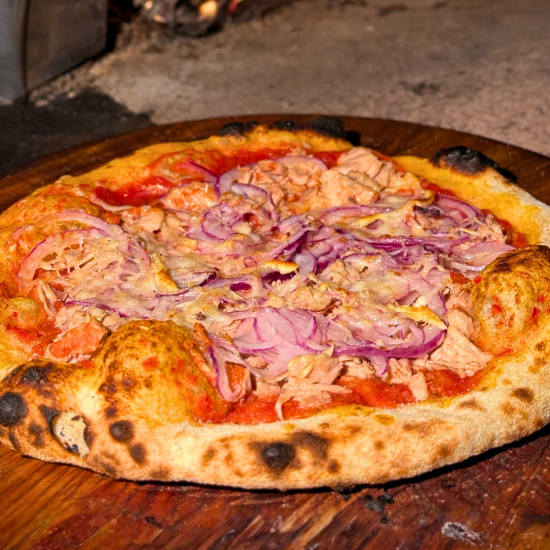 Atum em lascas generosas, parmesão ralado na hora e cebola roxa fininha sobre nossa massa de longa fermentação com molho rústico, assada ao forno a lenha. Leve, saborosa e cheia de personalidade, com aquele toque mediterrâneo irresistível.