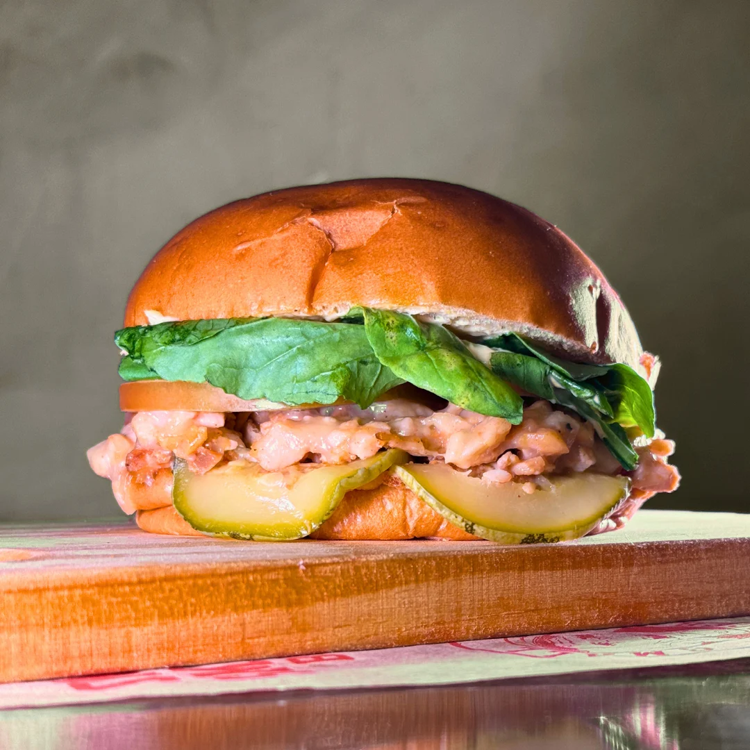 Uma explosão de sabor defumado. O frango da charcutaria Aqui em Casa é defumado lentamente para ficar macio e suculento. Ele se mistura perfeitamente ao frescor do tomate e da rúcula, enquanto o picles artesanal de abobrinha entrega acidez equilibrada. Cremoso, leve e cheio de personalidade.