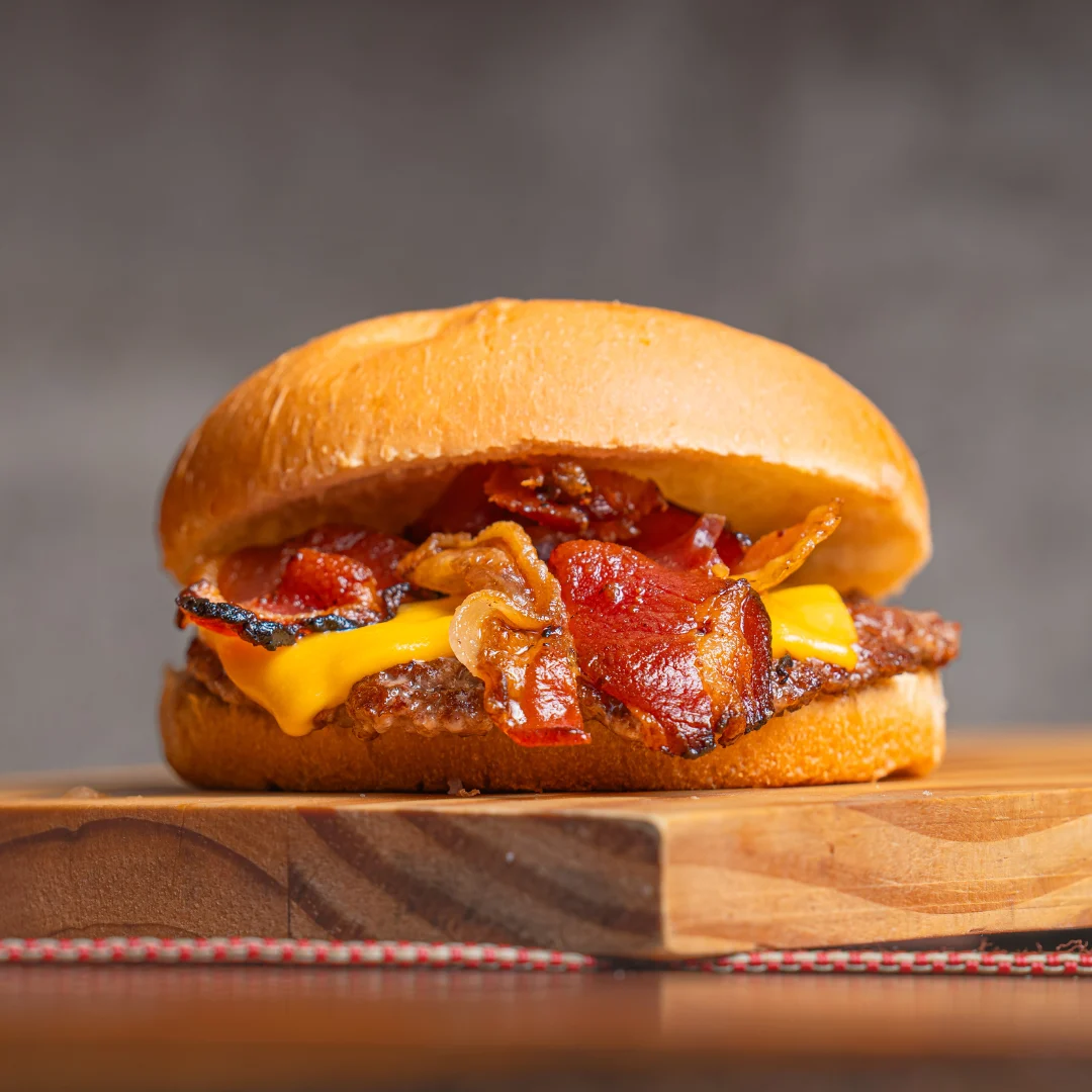 Para os pequenos, que já são amantes de bacon! Pão fofinho, hambúrguer, American cheese e fatias crocantes de bacon. Um clássico para fazer sucesso com as crianças.