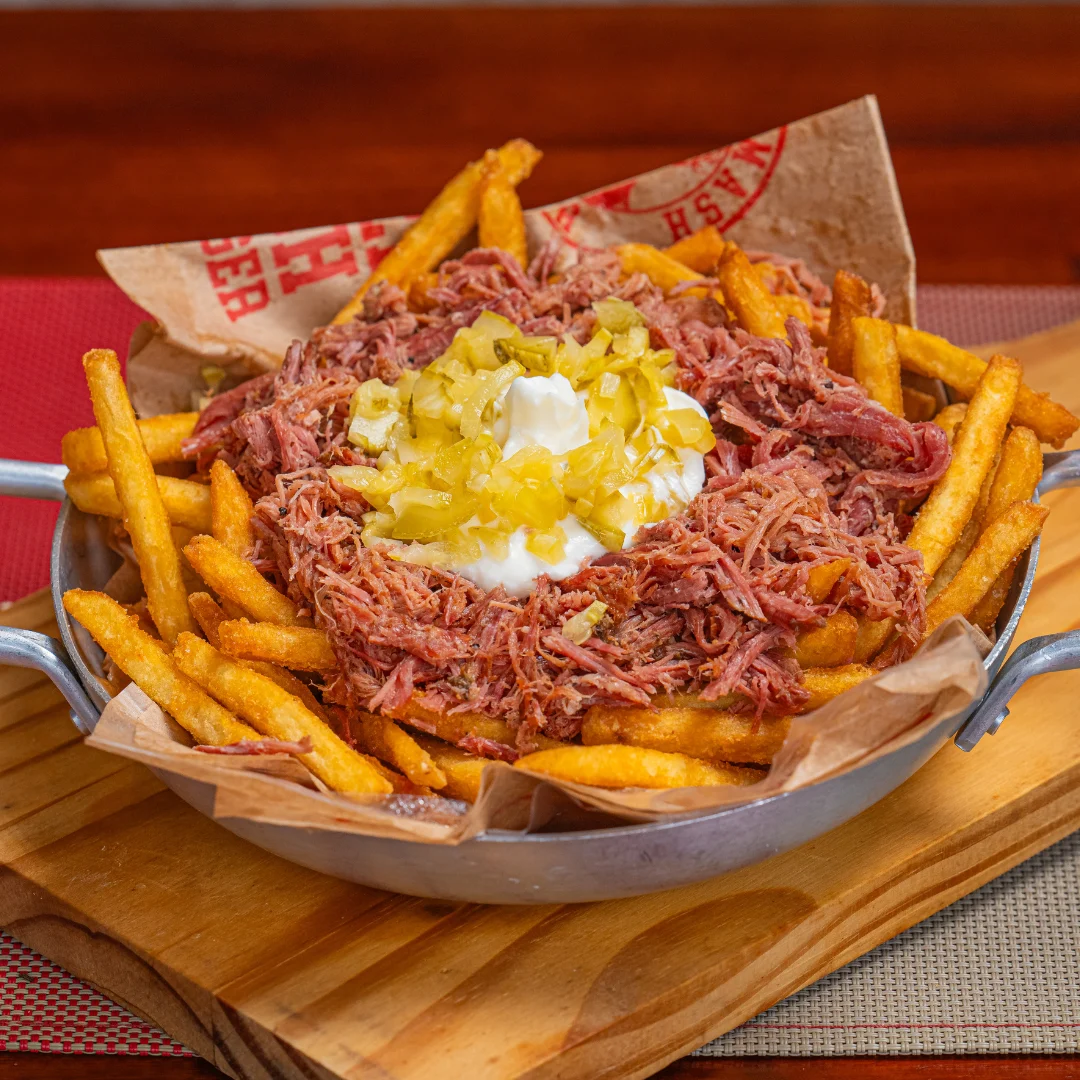 Batatas fritas EXTRA CROCANTES, cobertas com pastrami desfiado super macio e uma generosa camada de sour cream cremoso. Uma explosão de sabor com contrastes perfeitos entre crocância, suculência e frescor!