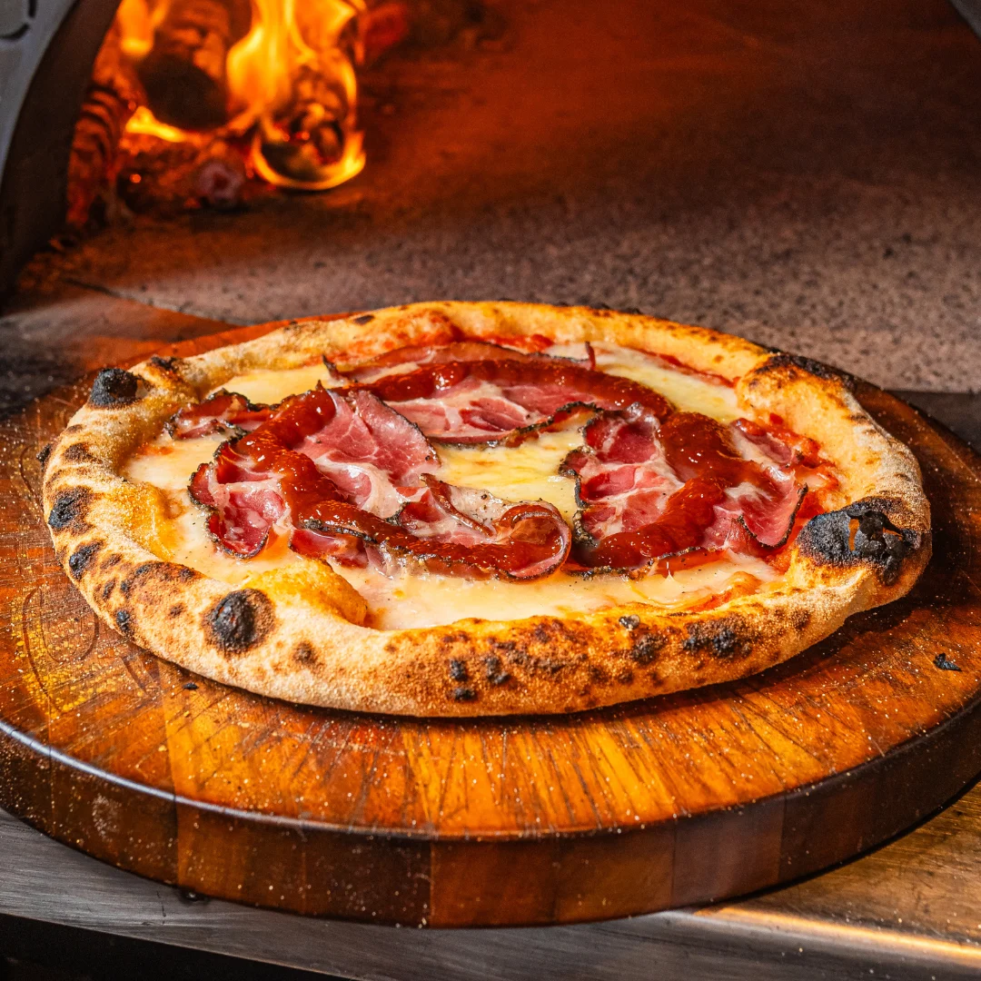 Copa defumada artesanal e goiabada. Surpreendente! Nossa copa defumada artesanal combina de forma única com a goiabada, criando uma explosão de sabores doces e salgados que é finalizada com a cremosidade da mussarela especial. Uma pizza única para os amantes de contrastes.