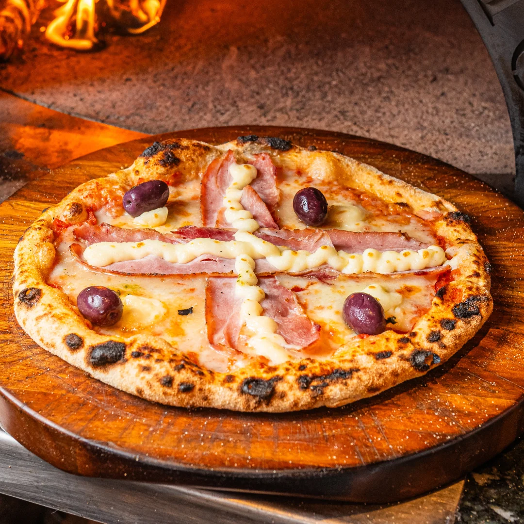 Presunto defumado e Catupiry legítimo. Uma explosão de sabores! Presunto defumado artesanalmente na casa, combinado com a cremosidade do Catupiry legítimo e mussarela, tudo finalizado com azeitonas pretas. Uma pizza para quem aprecia qualidade e sabor.