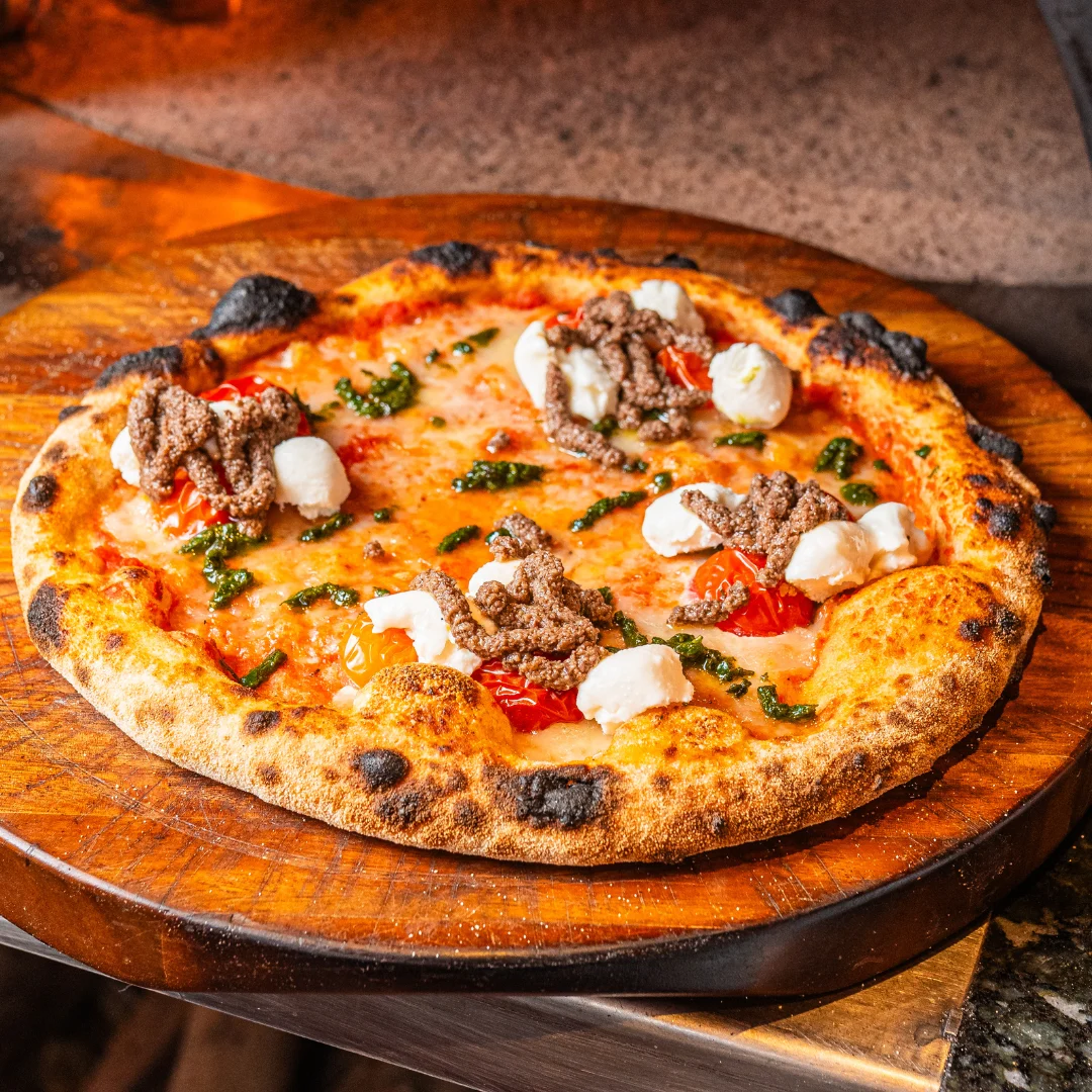 Mussarela de búfala, tomatinhos, manjericão e azeitonas. Fresca e leve! Mini mussarelas de búfala derretidas, folhas frescas de manjericão, tomatinhos e azeitonas azapa compõem essa deliciosa pizza, que traz o equilíbrio perfeito de ingredientes mediterrâneos.